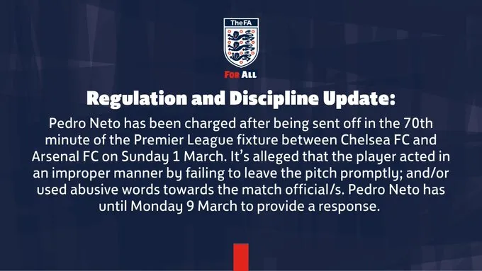 佩德罗-内托在3月1日星期日切尔西对阵阿森纳的英超联赛中,于第70分钟被红牌罚下后,已被指控行为不当。
